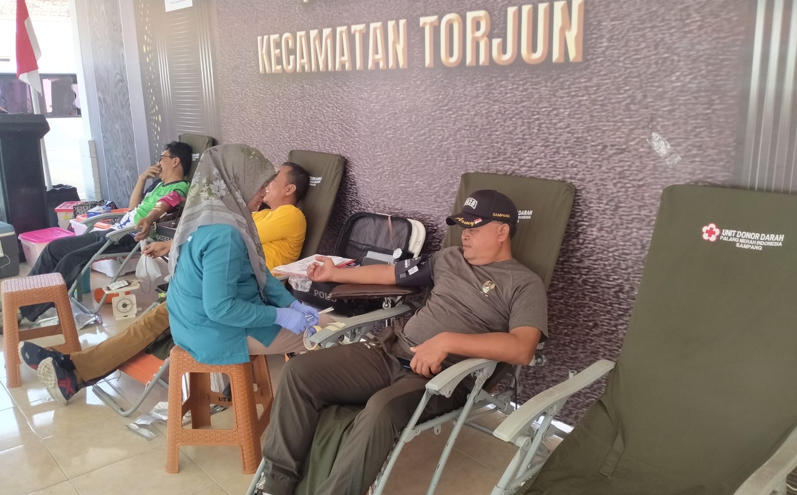Torjun – Babinsa Koramil 0828/04 Torjun, Peltu Muhammad, bersama dengan anggota Forkopincam Kecamatan Torjun, melaksanakan kegiatan donor darah yang bertempat di halaman kantor Kecamatan Torjun, Kabupaten Sampang. Kegiatan ini dilaksanakan sebagai bentuk kepedulian terhadap sesama dan dukungan terhadap upaya pemenuhan stok darah di rumah sakit.