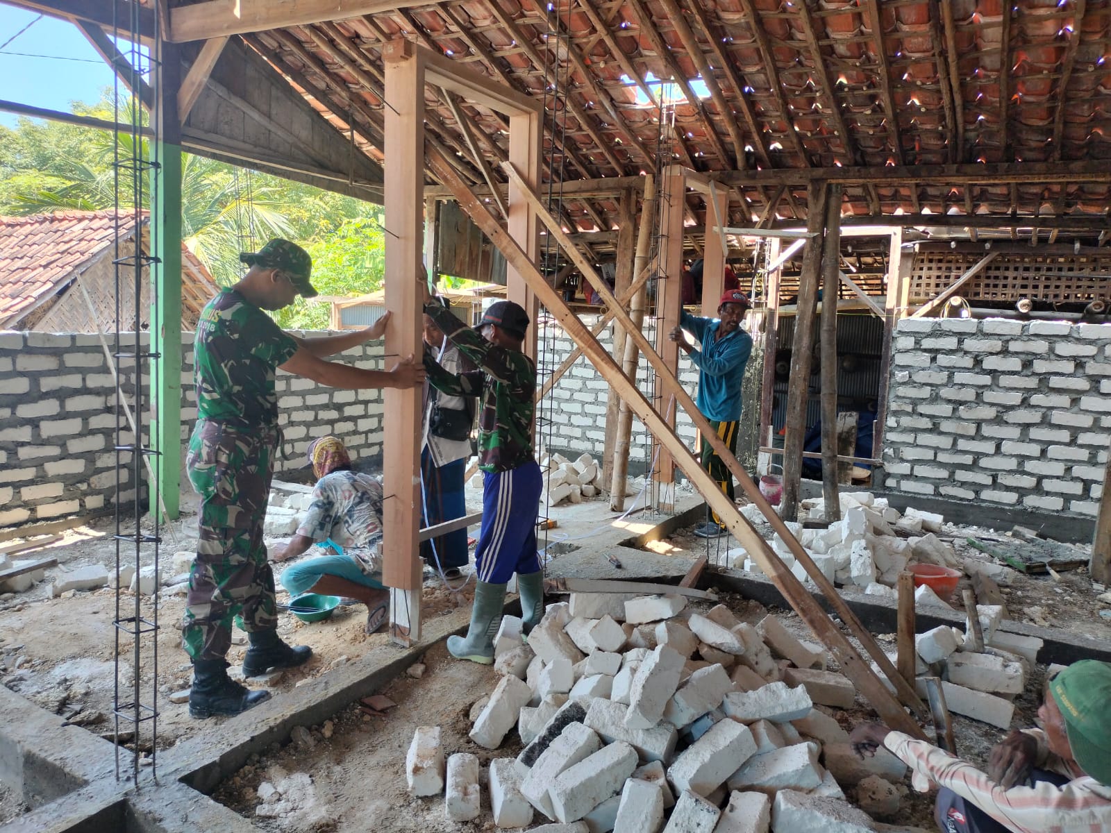Tahapan pembangunan rumah kini telah memasuki proses pendirian dinding dan pemasangan kusen. Suara palu bersahutan, menggambarkan tekad para prajurit TNI bersama warga untuk mewujudkan hunian yang layak dan nyaman bagi Ibu Harifah.