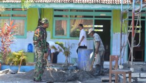 Dengan tangan-tangan cekatan dan penuh semangat, personel Satgas bersama warga bahu-membahu mengkuliti dan melapisi tembok ruang UKS dengan semen. Langkah ini menjadi bagian dari upaya menciptakan lingkungan sekolah yang sehat, bersih, dan layak guna menunjang pelayanan kesehatan dasar bagi para siswa.