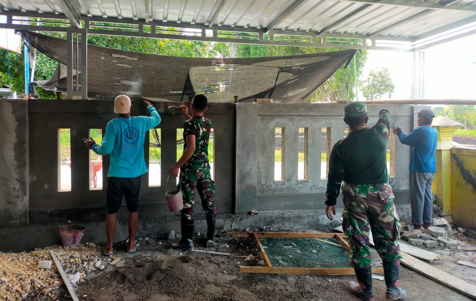 Semangat kebersamaan tampak nyata saat para prajurit dan masyarakat memplester tembok pagar ruang tunggu Polindes. Dengan alat sederhana dan keringat yang tulus, mereka menyatukan tenaga demi terciptanya sarana kesehatan yang lebih layak dan nyaman bagi masyarakat.