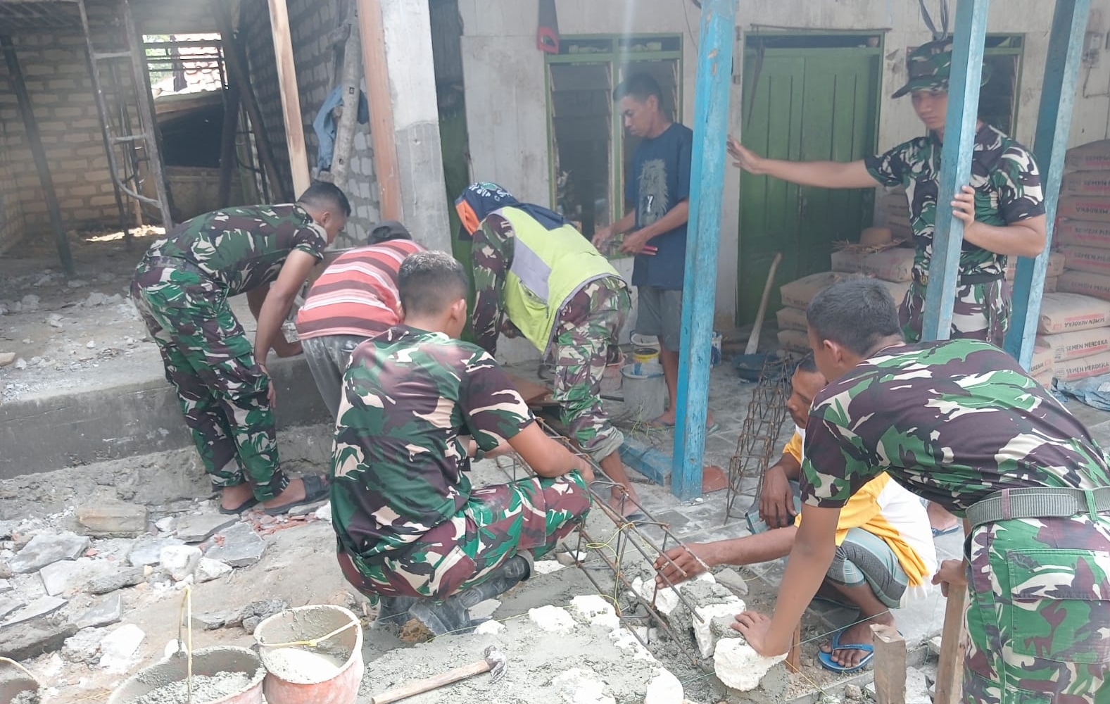 Progres pembangunan rumah Ibu Umrina menunjukkan hasil menggembirakan. Dengan penuh semangat, anggota Satgas dan masyarakat sekitar tampak kompak menyiapkan adukan semen dan memoleskan plester pada dinding, sebagai wujud nyata kolaborasi antara TNI dan rakyat.