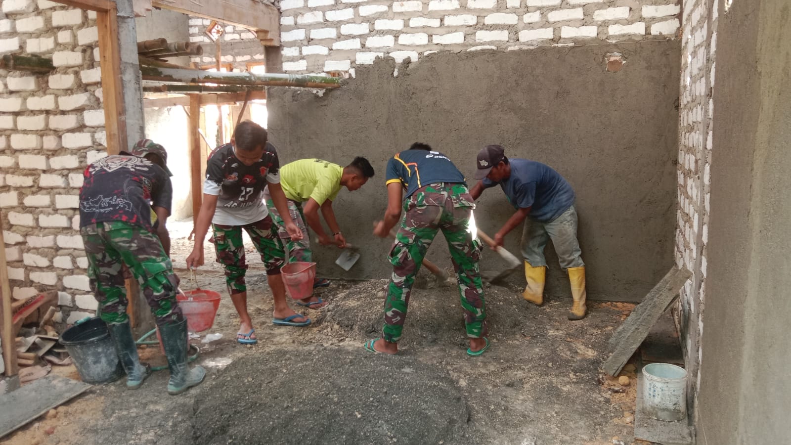 Dengan penuh semangat, para anggota Satgas TMMD dan warga bahu-membahu menyelesaikan tahapan plester dinding dalam rumah. Kegiatan ini merupakan bagian dari upaya rehabilitasi Rutilahu dalam rangka meningkatkan kualitas hunian warga kurang mampu, sekaligus memperkuat hubungan emosional antara TNI dan masyarakat.