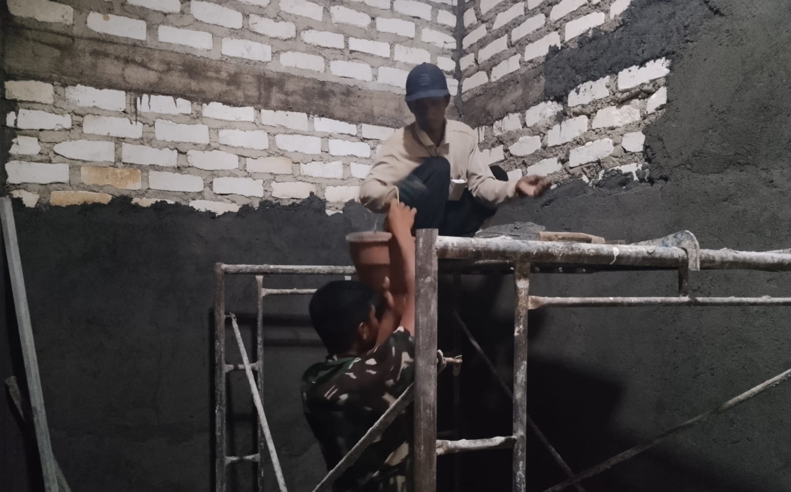 Memasuki tahapan penting, Satgas TMMD bersama warga dan tukang lokal yang andal, bahu-membahu mengerjakan plester dinding bagian dalam rumah Ibu Umrina. Hujan ataupun terik, tak menyurutkan semangat prajurit TNI yang terus menebar manfaat dan harapan bagi masyarakat.