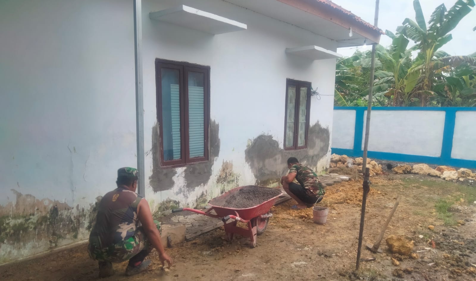 Satgas TMMD bersama warga desa bahu-membahu melanjutkan tahap pengecatan dan plamir tembok bangunan. Meski dihadapkan dengan cuaca yang tak menentu, semangat para personel tidak pernah surut. Mereka tetap melanjutkan pekerjaan dengan penuh dedikasi demi memberikan kenyamanan dan fasilitas kesehatan yang lebih layak bagi masyarakat setempat.