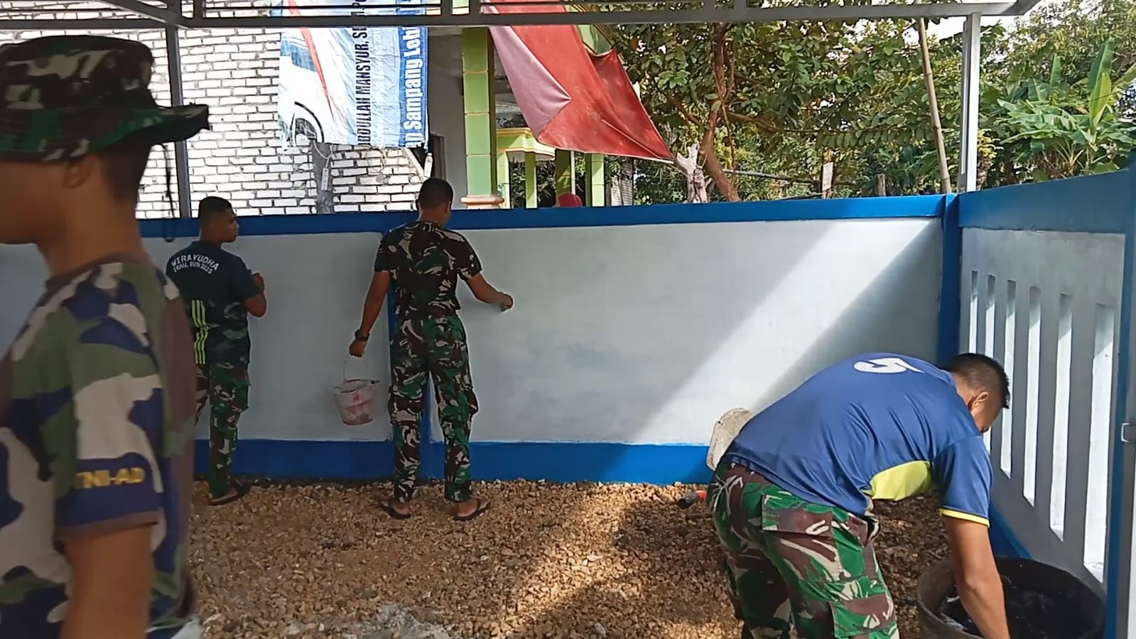 Memasuki tahap pengecatan tembok pagar, Satgas TMMD bersama masyarakat bahu-membahu menuntaskan pengerjaan dengan semangat gotong royong. Warna-warna cat mulai menghiasi dinding pagar, menjadi simbol kehadiran negara dalam menjawab kebutuhan dasar masyarakat pedesaan, khususnya di bidang kesehatan.
