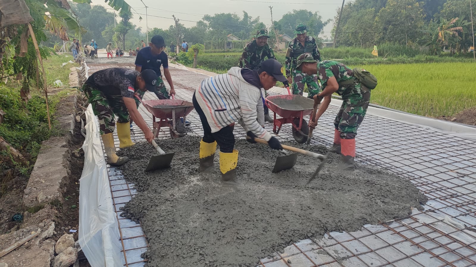 TNI dan Warga Desa Batu Karang Kompak! Semangat Tawa Ceria Warnai Pengecoran Jalan TMMD ke-124