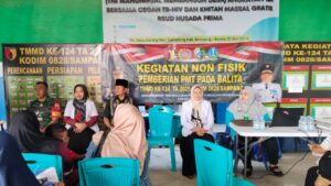 Kegiatan berlangsung dengan antusias, diikuti oleh puluhan warga yang tampak aktif bertanya dan mengikuti arahan tenaga kesehatan. Kegiatan ini menjadi bagian penting dalam keberhasilan TMMD yang tidak hanya fokus pada pembangunan fisik, tetapi juga menyentuh aspek sosial dan kesehatan masyarakat.