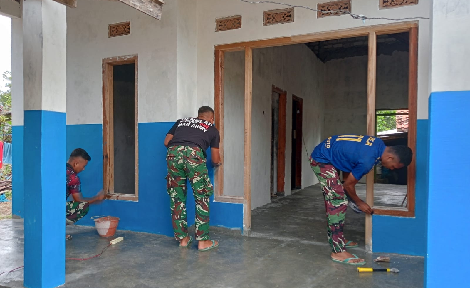 Memasuki tahap akhir, rumah Ibu Umrina kini tengah dalam proses pengecatan tembok. Satgas TMMD bersama warga dengan penuh semangat memberikan sentuhan akhir berupa warna-warna cantik yang menghadirkan suasana baru penuh harapan. Pengecatan ini bukan hanya sebatas memperindah tampilan, namun juga menjadi simbol perubahan dan semangat hidup yang lebih baik bagi sang pemilik rumah.