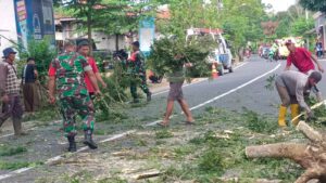 Kedungdung — Dalam wujud nyata pengabdian kepada masyarakat, Babinsa Koramil 0828/10 Kedungdung, Serma Samsuri, bersama warga dan unsur terkait melaksanakan pengamanan serta membantu proses penebangan pohon tumbang yang melintang di jalan utama jalur utara Kecamatan Kedungdung, Kabupaten Sampang.