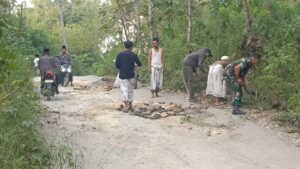 Kedungdung, Sampang – Bentuk nyata kepedulian terhadap masyarakat, Babinsa Koramil 0828/10 Kedungdung, Serda Andrias, turut serta membantu warga dalam kegiatan perbaikan jalan di Dusun Batuporo Barat, Desa Batuporo Barat, Kecamatan Kedungdung, Kabupaten Sampang, pada hari ini.