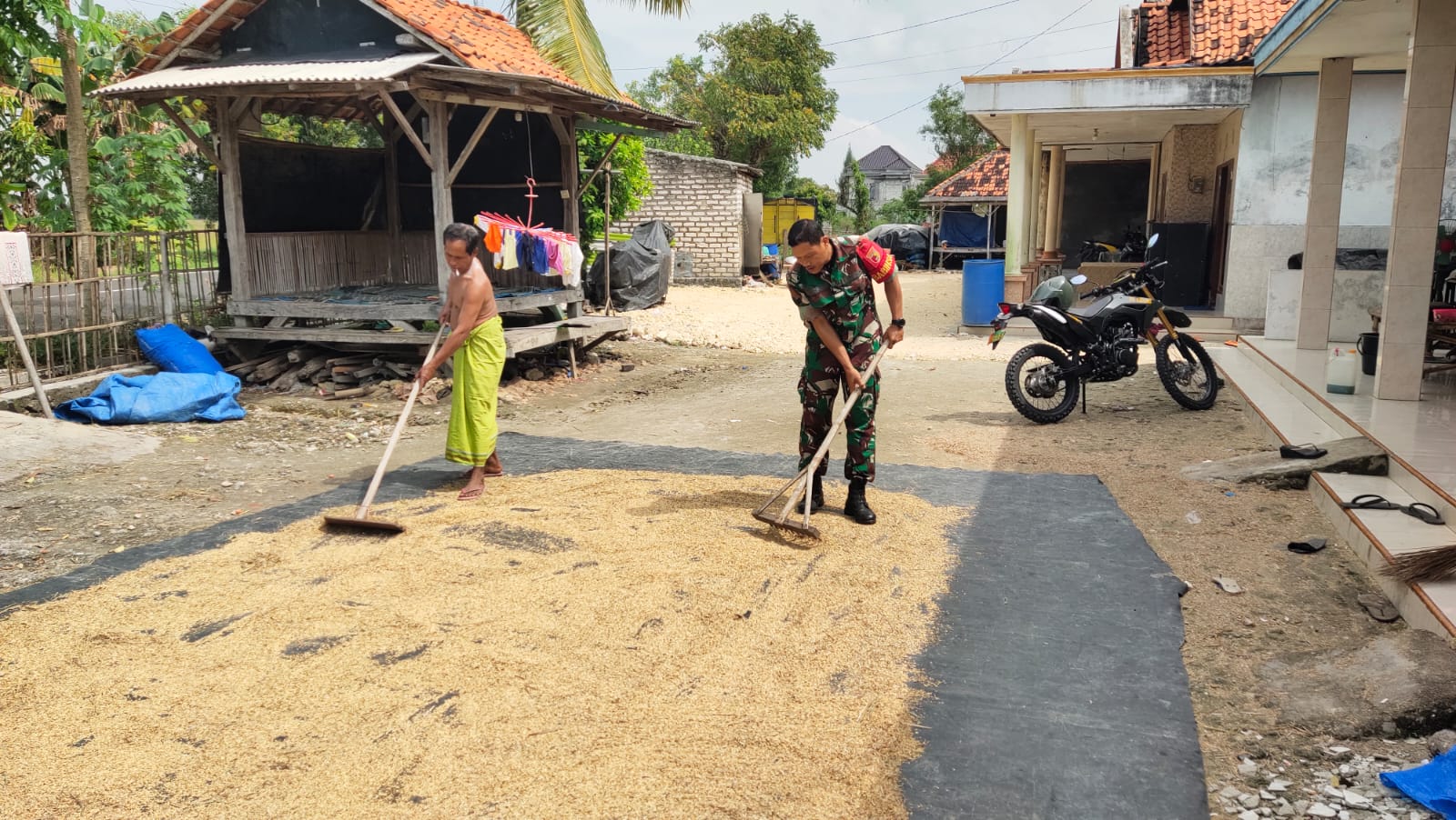 Sampang, 31 Juli 2025 – Wujud nyata kedekatan TNI dengan rakyat kembali ditunjukkan oleh Babinsa Pos Ramil 0828/13 Pangarengan, Serka Lery Ismanto, yang terjun langsung membantu petani menjemur gabah padi di Dusun Mortonggek, Desa Ragung, Kecamatan Pangarengan, Kabupaten Sampang.