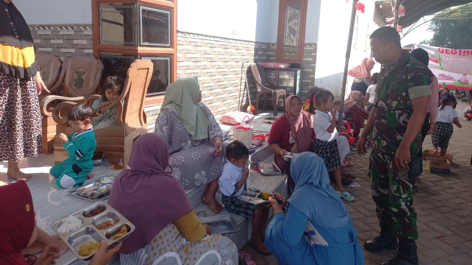 Dengan penuh kepedulian, para Babinsa turut membantu pendistribusian makanan, memberikan edukasi ringan tentang pentingnya gizi, serta memastikan kegiatan berlangsung tertib dan lancar.