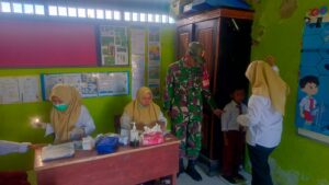 Dengan penuh semangat dan keramahan, tim medis dari Puskesmas Camplong melakukan serangkaian pemeriksaan kesehatan seperti pengukuran tinggi dan berat badan, pemeriksaan gigi, mata, dan pendataan status imunisasi. Kehadiran Babinsa di tengah kegiatan tersebut bukan hanya sebagai pendamping, namun juga motivator bagi para siswa agar lebih peduli terhadap kesehatan sejak dini.