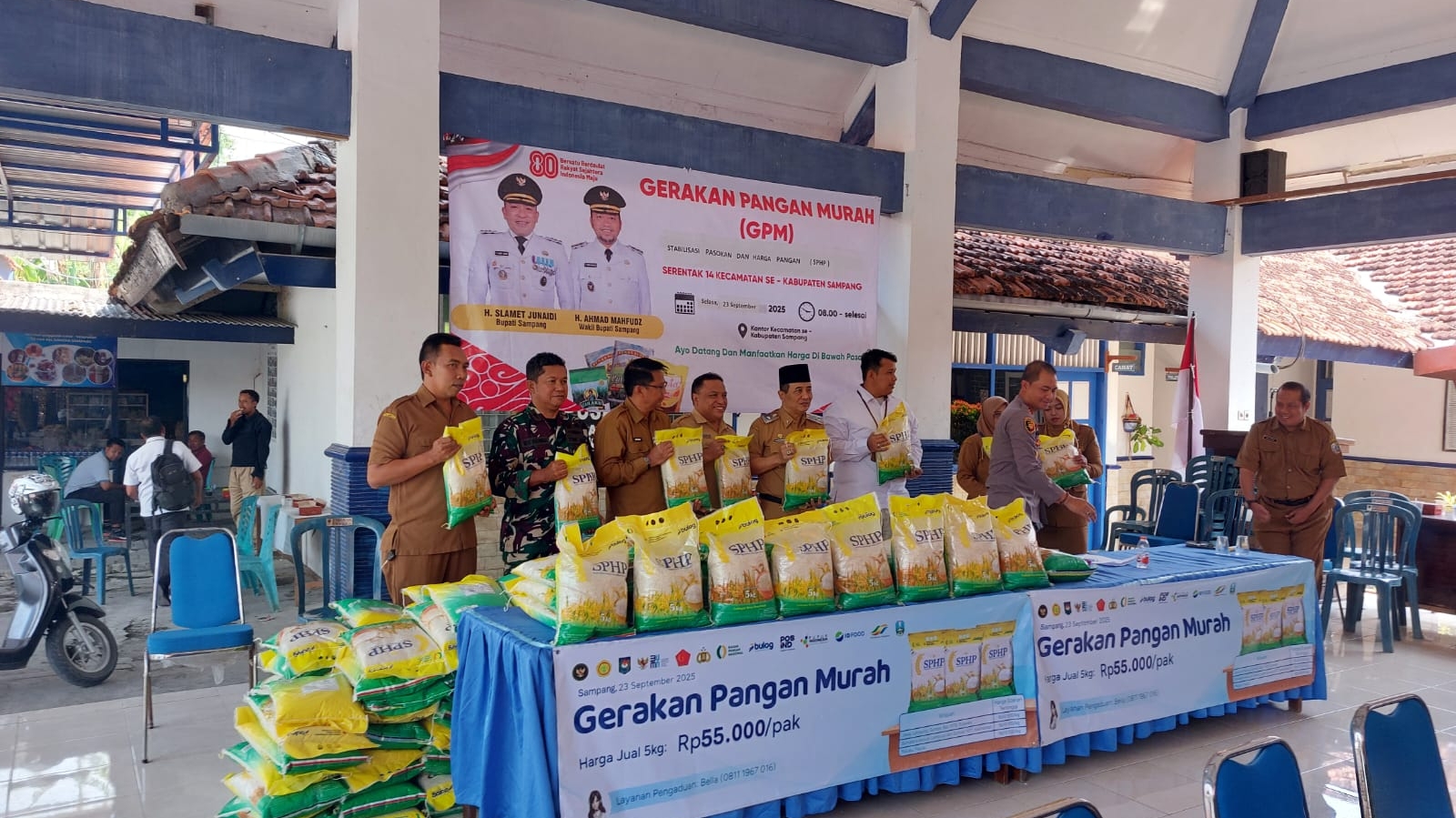 Sampang— Komandan Koramil (Danramil) 0828/01 Sampang, Lettu Cba Heri, bersama unsur Forkopimcam (Forum Koordinasi Pimpinan Kecamatan) melaksanakan kegiatan Gerakan Pangan Murah (GPM) yang digelar di halaman Kantor Kecamatan Sampang, Kabupaten Sampang.