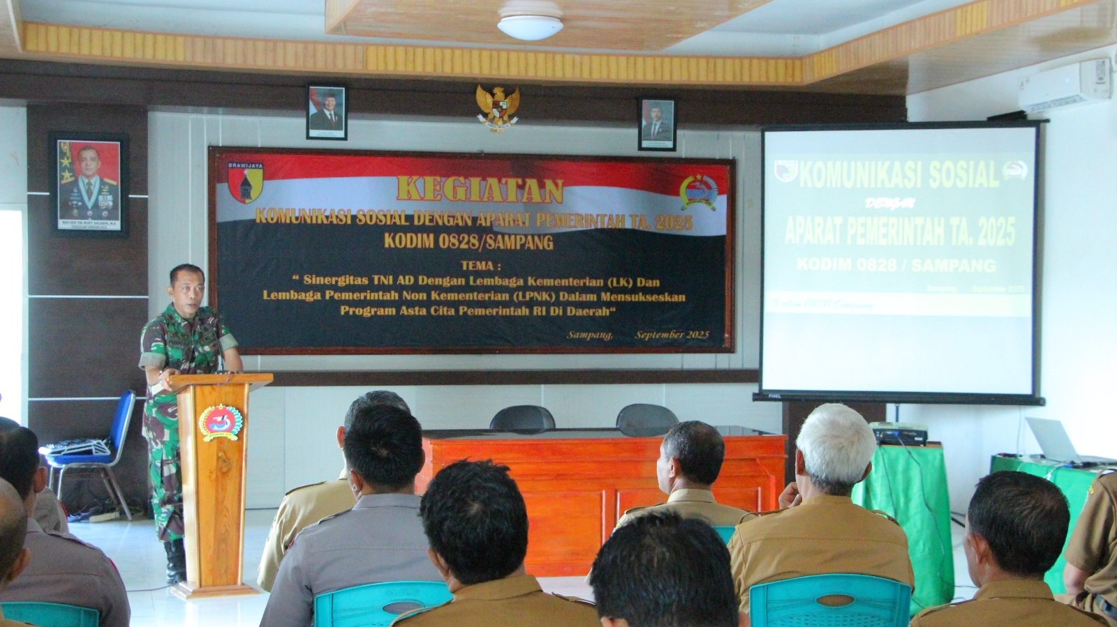 Sampang – Komando Distrik Militer (Kodim) 0828/Sampang menggelar kegiatan Komunikasi Sosial (Komsos) bersama Aparat Pemerintah (Apem) yang bertempat di Aula Makodim Sampang. Kegiatan ini mengusung tema: “Sinergitas TNI AD dengan Lembaga Kementerian (LK) dan Lembaga Pemerintah Non Kementerian (LPNK) dalam Mensukseskan Program Asta Cita Pemerintah RI di Daerah.”