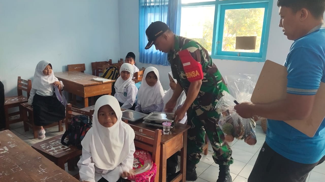 Omben –Sebagai bentuk komitmen TNI dalam mendukung program pemerintah di bidang ketahanan pangan dan peningkatan gizi anak sekolah, Babinsa Koramil 0828/03 Omben, Serka M. Saifullah, melaksanakan kegiatan pembinaan teritorial (binter) dengan mendampingi penyaluran bantuan Makan Bergizi Gratis (MBG) ke sejumlah sekolah penerima manfaat di wilayah Kecamatan Omben, Kabupaten Sampang.