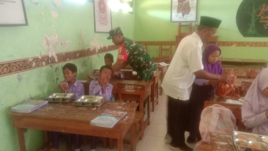 Kegiatan yang berlangsung dengan penuh antusias ini bertujuan untuk membentuk generasi sehat dan cerdas melalui asupan gizi seimbang sejak usia dini. Serka Harianto hadir langsung mendampingi pelaksanaan program, sekaligus memberikan semangat kepada para siswa agar senantiasa menjaga pola makan yang sehat dan bergizi.