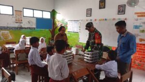 Sampang— Dalam upaya mendukung program pemerintah untuk meningkatkan gizi dan kesehatan anak-anak sekolah, Babinsa Koramil 0828/03 Omben Sertu Nasirudin turut serta mendampingi kegiatan penyaluran Makan Bergizi Gratis (MBG) di SDN Desa Karang Gayam, Kecamatan Omben, Kabupaten Sampang.