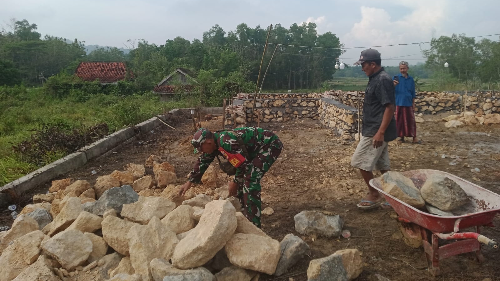 Dengan semangat kebersamaan, warga Desa Rohayu bersama Babinsa bekerja membangun pondasi dapur sederhana agar keluarga tersebut dapat memiliki tempat memasak yang layak.