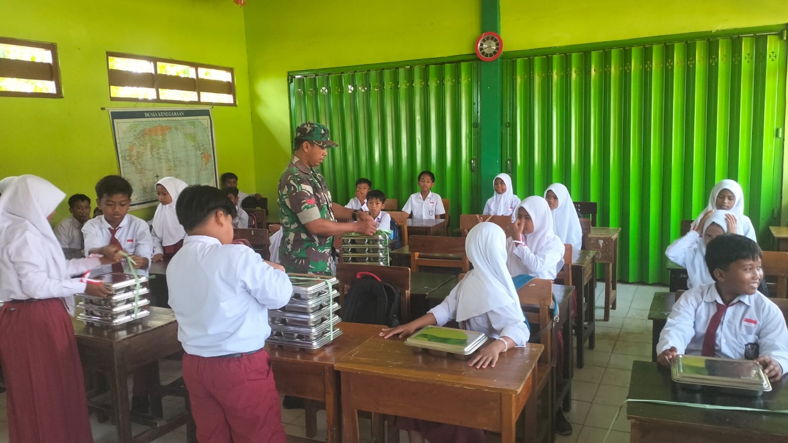 Sampang – Babinsa Koramil 0828/08 Sokobanah, Kopka Basuki Rahmat, menunjukkan kepedulian terhadap peningkatan gizi anak sekolah dengan melaksanakan pendampingan pendistribusian Makan Bergizi Gratis (MBG) di berbagai sekolah wilayah Desa Sokobanah Daya, Kecamatan Sokobanah, Kabupaten Sampang.