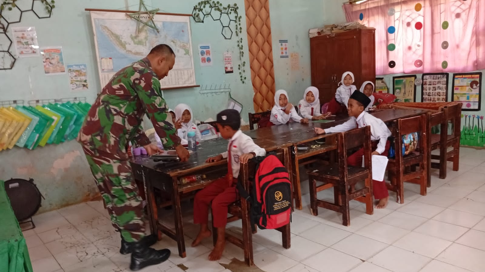 Omben — Babinsa Koramil 0828/03 Omben, Sertu Nasirudin, melaksanakan pendampingan pendistribusian Makanan Bergizi Gratis (MBG) kepada para siswa di sejumlah sekolah yang berada di Desa Karanggayam, Kecamatan Omben, Kabupaten Sampang.