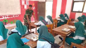 Sampang – Babinsa Koramil 0828/12 Robatal, Serda Yeka, melaksanakan kegiatan pendampingan dalam pendistribusian Makan Bergizi Gratis (MBG) kepada para siswa di salah satu sekolah dasar yang berada di Desa Pandiyangan, Kecamatan Robatal, Kabupaten Sampang.