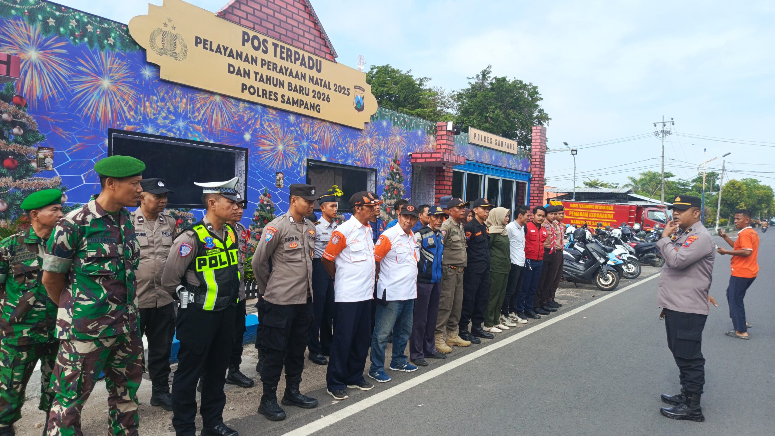 Sampang – Dalam rangka perayaan Natal dan Tahun Baru 2026, Babinsa Koramil 0828/01 Sampang, Serka Hariyanto, bersama anggota Polsek Sampang melaksanakan pengamanan di Pos Pantau Nataru yang terletak di Alun-Alun Trunojoyo, Kabupaten Sampang.