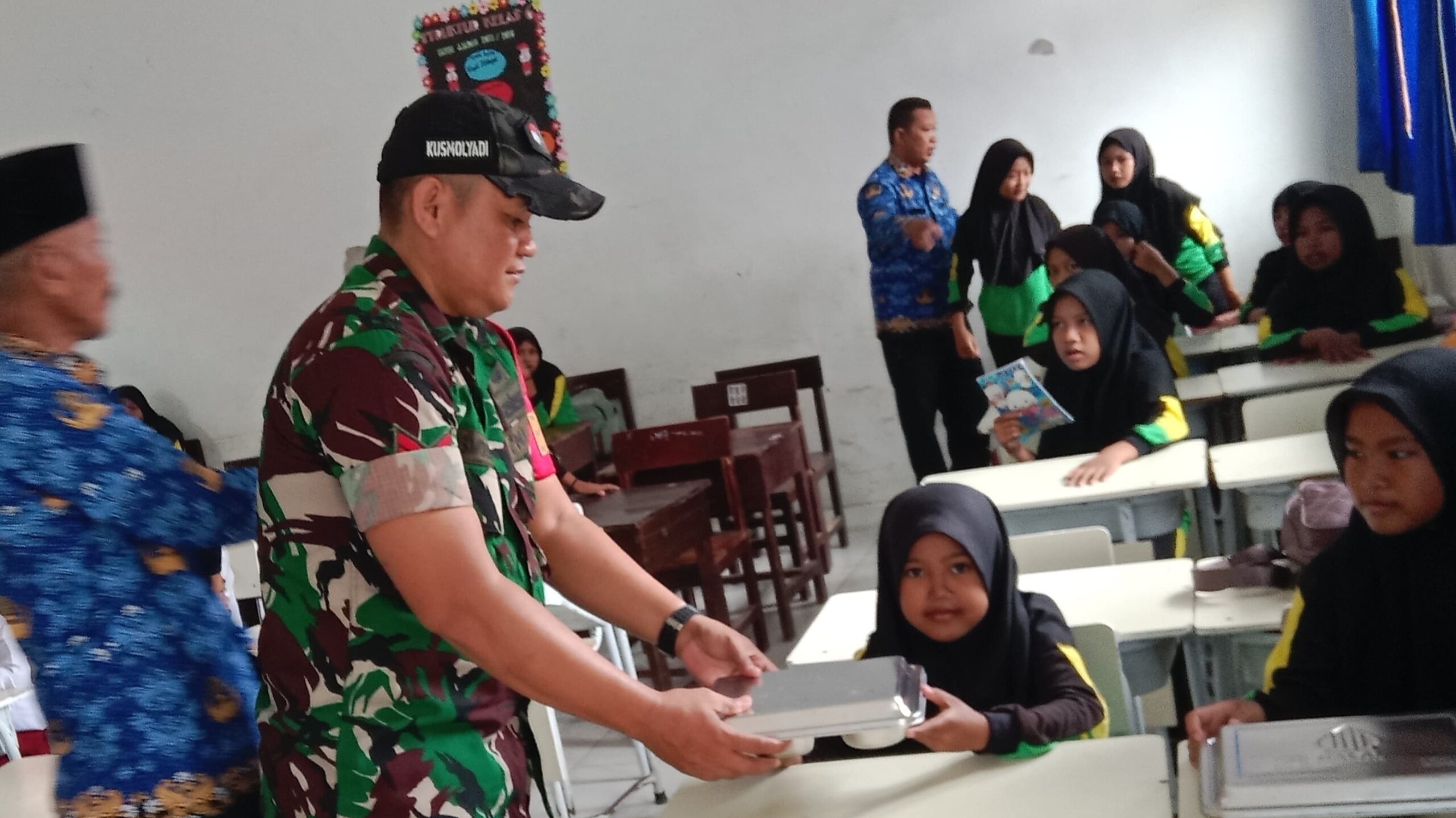 Sampang – Babinsa Koramil 0828/03 Omben, Koptu Kusmolyadi, melaksanakan pendampingan pendistribusian Program Makan Bergizi Gratis (MBG) kepada sekolah penerima manfaat yang berada di Desa Kamondung, Kecamatan Omben, Kabupaten Sampang.