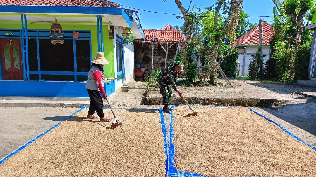 Kebersamaan Babinsa Koramil Sreseh dan Warga Jemur Padi