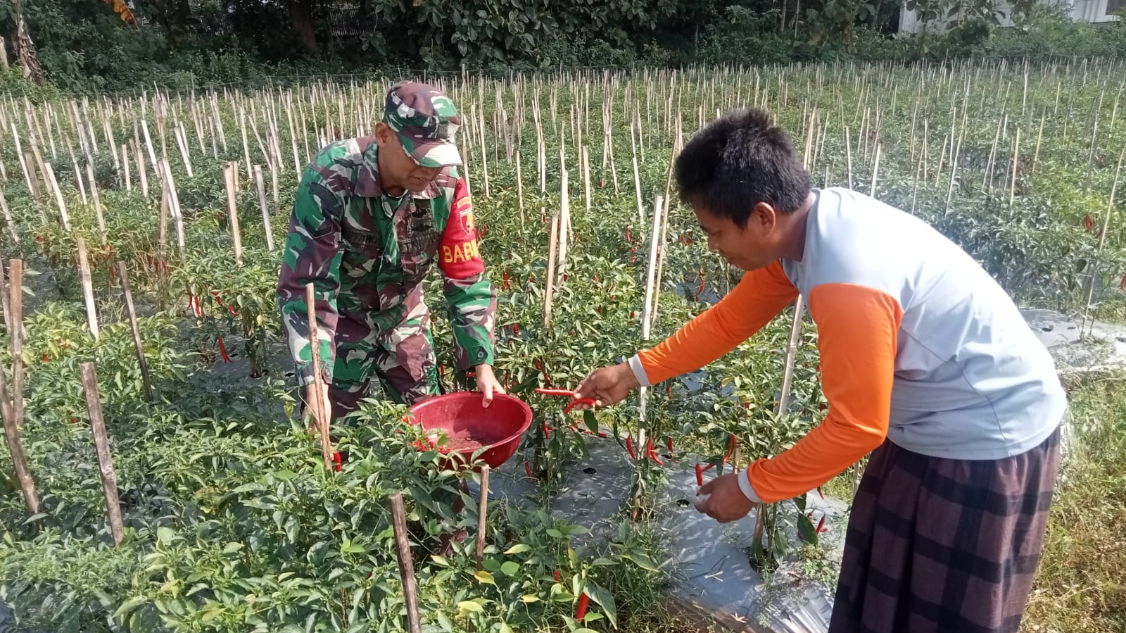 Dengan penuh semangat dan kebersamaan, Serda Suyitno mendampingi petani dalam kegiatan merawat tanaman cabai merah, mulai dari pembersihan gulma hingga memastikan kondisi tanaman tetap sehat dan produktif. Kehadirannya tidak hanya memberikan bantuan tenaga, tetapi juga menumbuhkan motivasi serta semangat bagi para petani.