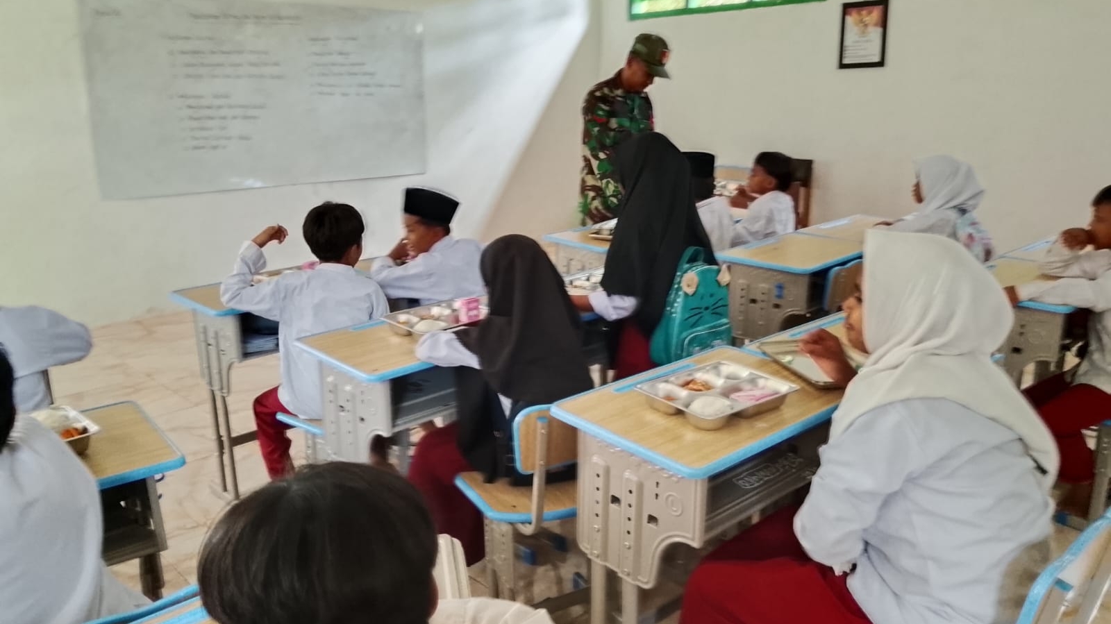 Dengan penuh keakraban, Kopda Hendrid turut berinteraksi langsung dengan para siswa, memastikan kegiatan berjalan tertib, aman, dan lancar. Para siswa pun tampak antusias menikmati makanan bergizi yang telah disiapkan.